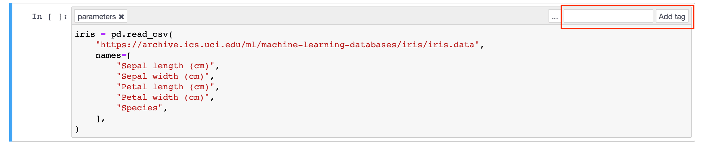 To accomplish this, we need to tag the cell in the iris-kmeans notebook that fetches the Iris dataset. This allows us to replace the cell with the data-fetching logic that loads the iris_dataset asset and retain the ability to run the Jupyter notebook in a standalone context. We'll cover this in more detail later in the tutorial.